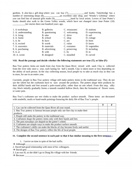 I. Choose a word in each line that has different stress pattern: 1. A. famous B. village C. workshop D. bamboo 2. A. business B. experience C. grandparent D. chocolate 3. A. generation B. communicate C. historical D. environment 4. A. embroider B. department C. handicraft D. opinion 5. A. transfer B. publish C. accept D. remind 6. A. attraction B. artisan C. frame D. handicraft 7. A. drumhead B. illustration C. earplug D. drugstore 8. A. strip B. visual C. artistic D. remind 9. A. thread B. treat C. pleasure D. deadline 10. embroider B. preserve C. benefit D. effect