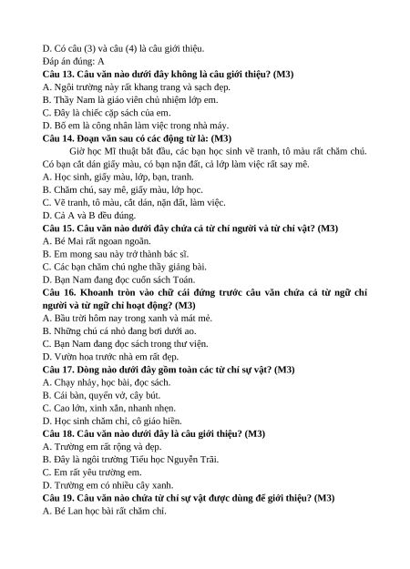 Câu 19. Câu văn nào chứa từ chỉ sự vật được dùng để giới thiệu? (M3)