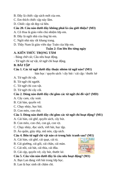 Câu 2. Dòng nào dưới đây chỉ gồm các từ ngữ chỉ đồ vật? (MD) A. Cây cam, cây xoài. B. Cái bàn, quyển vở. C. Chạy nhảy, học bài. D. Con mèo, con chó.