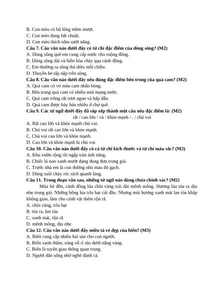 Câu 1. Dòng nào dưới đây chỉ chứa từ ngữ chỉ sự vật? (M1) A. Học tập, vui chơi B. Lao động, ăn uống C. Cặp sách, quần áo