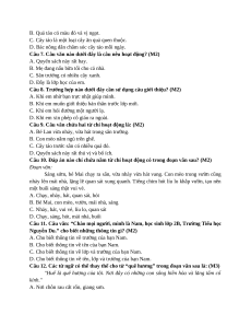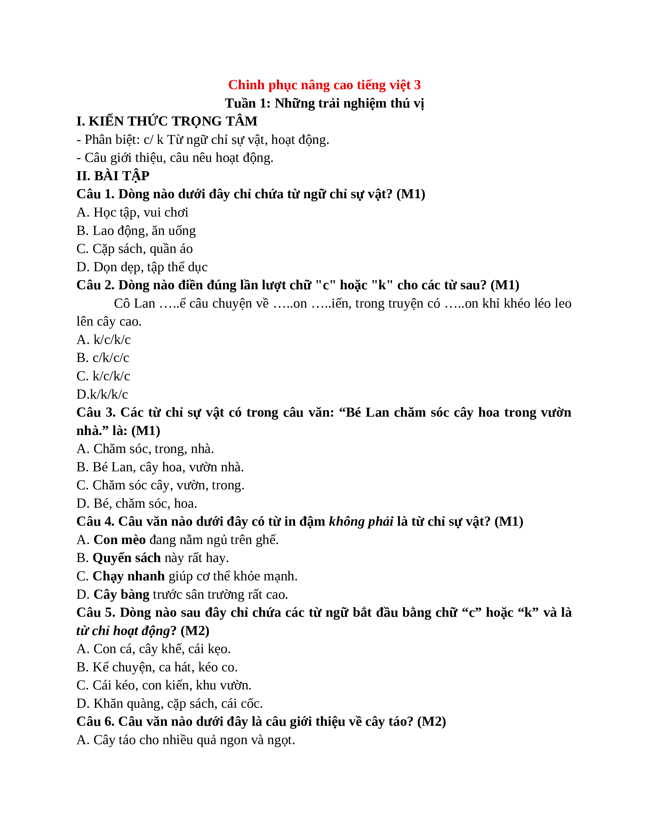 Câu 1. Dòng nào dưới đây chỉ chứa từ ngữ chỉ sự vật? (M1) A. Học tập, vui chơi B. Lao động, ăn uống C. Cặp sách, quần áo