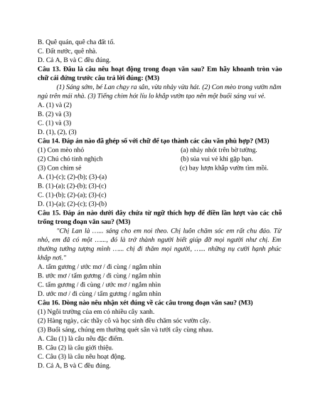 Câu 16. Dòng nào nêu nhận xét đúng về các câu trong đoạn văn sau? (M3)