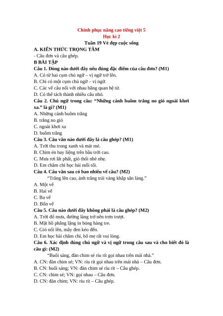 Câu 5. Câu nào dưới đây không phải là câu ghép? (M2)