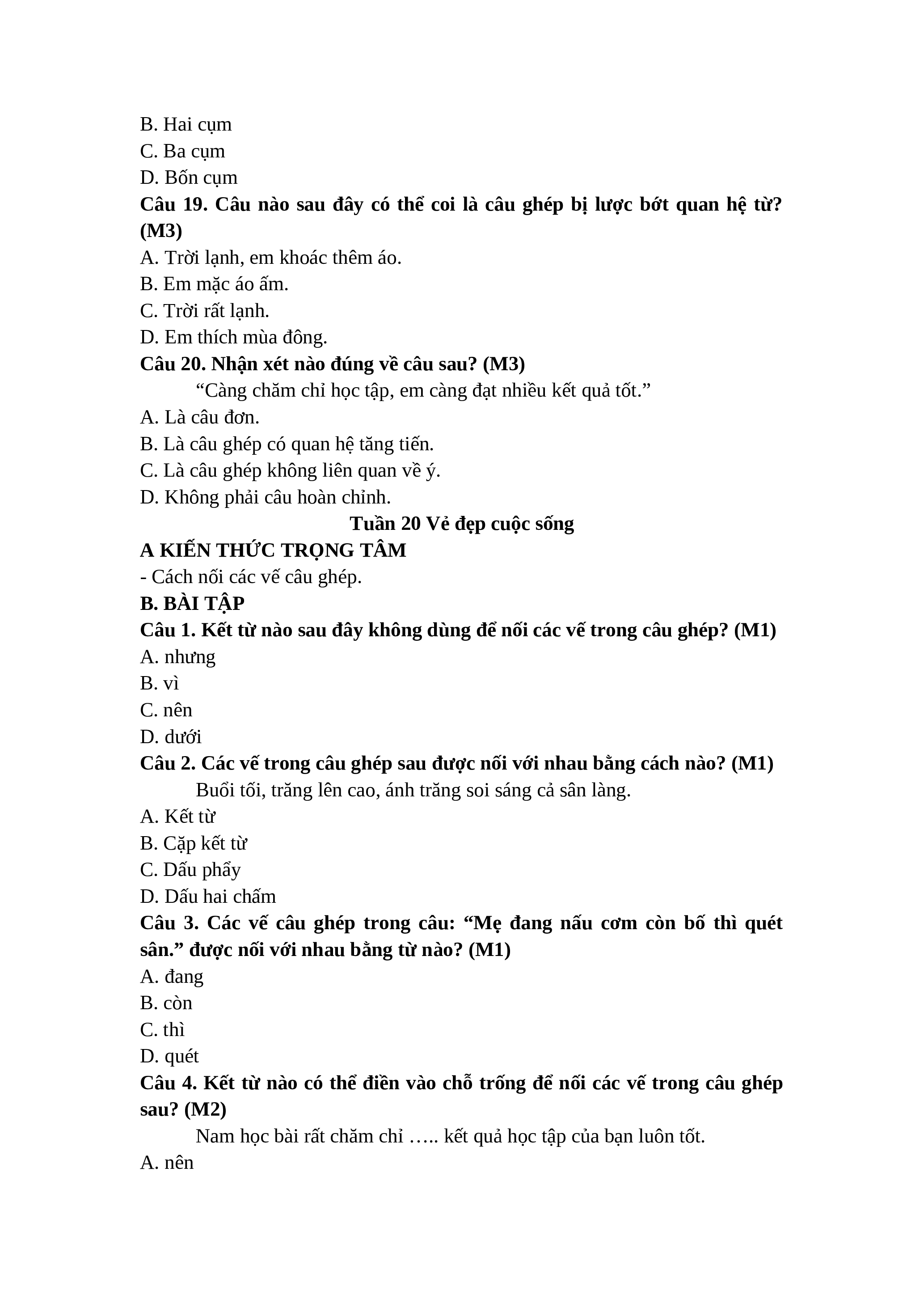 Câu 1. Kết từ nào sau đây không dùng để nối các vế trong câu ghép? (M1) A. nhưng B. vì C. nên D. dưới