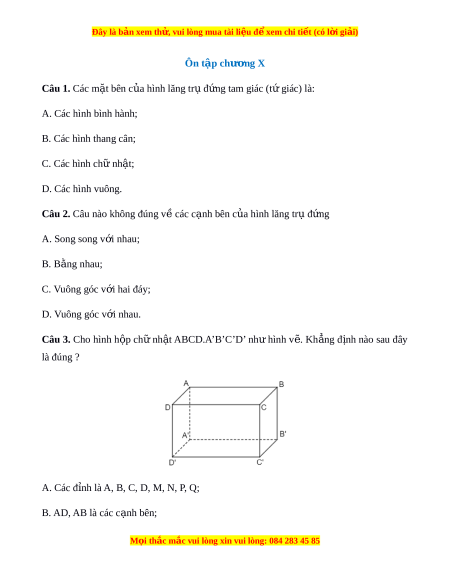 Đây là bản xem th , vu ử i lòng mua tài li u ệ đ xe ể m chi ti t (c ế ó l i ờ gi i ả ) Ôn tập chư ng ơ X Câu 1. Các m t ặ bên c a hì ủ nh lăng tr đ ụ ng t ứ am giác (t gi ứ ác) là: A. Các hình bình hành; B. Các hình thang cân; C. Các hình chữ nh t ậ ; D. Các hình vuông.