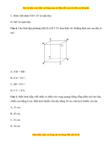 Câu 4. Cho hình l p ph ậ ư ng ơ ABCD.A’B’C’D’ nh hì ư nh v . K ẽ h ng ẳ đ nh nào ị sau đây là sai? A. A’B’ = BB’; B. A’A = A’C’; C. AB = D’C’; D. C’C = A’A. Câu 5. M t ộ hình h p ộ chữ nh t ậ có di n ệ tích xung quang b ng ằ t ng ổ di n ệ tích hai đáy, chi u ề cao b ng 6 cm ằ . M t ộ kích thư c ớ c a đáy b ủ ng