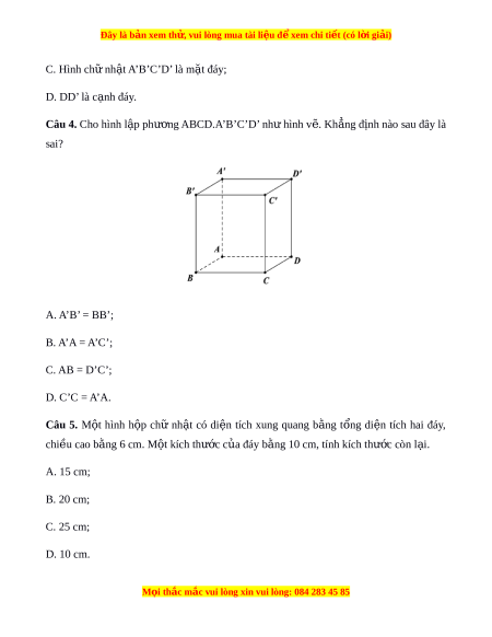 Đây là bản xem th , vu ử i lòng mua tài li u ệ đ xe ể m chi ti t (c ế ó l i ờ gi i ả ) C. Hình ch nh ữ t ậ A’B’C’D’ là m t ặ đáy; D. DD’ là c nh ạ đáy.