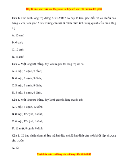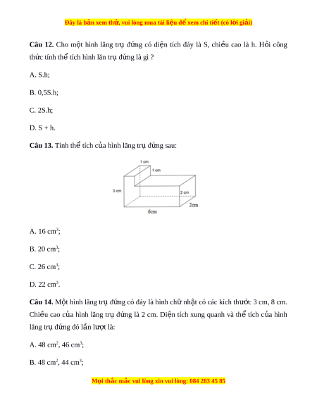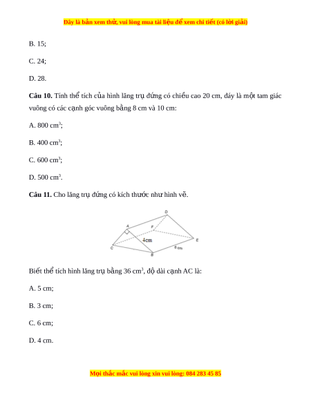 Đây là bản xem th , vu ử i lòng mua tài li u ệ đ xe ể m chi ti t (c ế ó l i ờ gi i ả ) B. 15; C. 24; D. 28. Câu 10. Tính th ể tích c a ủ hình lăng tr ụ đ ng ứ có chi u ề cao 20 cm, đáy là m t ộ tam giác vuông có các c nh ạ góc vuông b ng 8 cm ằ và 10 cm: A. 800 cm3; B. 400 cm3; C. 600 cm3; D. 500 cm3.