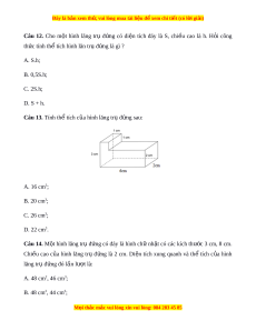 ằ 2 cm, tam giác ABB’ vuông cân t i ạ B. Tính di n ệ tích xung quanh c a ủ hình lăng tr . ụ A. 15 cm2; B. 6 cm2; C. 12 cm2; D. 16 cm2. Câu 7. M t ộ lăng tr đ ụ ng, đáy l ứ