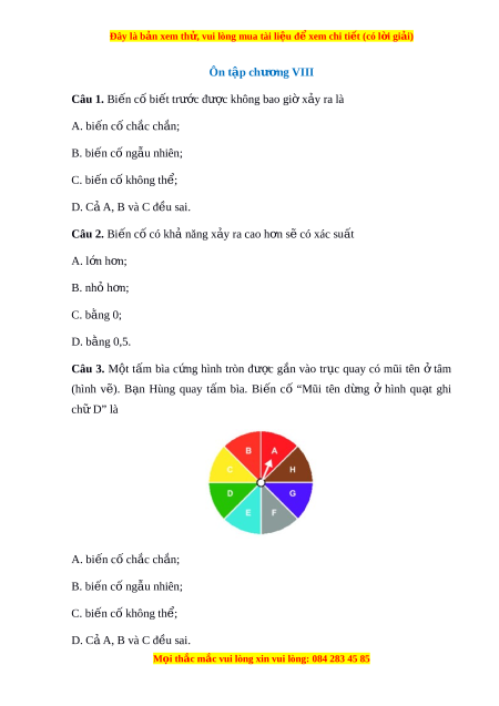 Đây là bản xem th , vu ử i lòng mua tài li u ệ đ xe ể m chi ti t ế (có l i ờ gi i ả ) Ôn tập chư ng ơ VIII Câu 1. Bi n c ế ố bi t ế trư c đ ớ ư c ợ không bao gi x ờ y ả ra là A. bi n c ế ố ch c ắ ch n ắ ; B. bi n c ế ố ngẫu nhiên; C. bi n c ế ố không thể; D. Cả A, B và C đ u s ề ai. Câu 2. Bi n c ế ố có khả năng x y r ả a cao h n s ơ ẽ có xác suất A. l n h ớ n ơ ; B. nh h ỏ n ơ ; C. b ng ằ 0; D. b ng 0,5 ằ . Câu 3. M t ộ tấm bìa c ng ứ hình tròn đư c ợ g n ắ vào tr c ụ quay có mũi tên ở tâm (hình v ) ẽ . B n ạ Hùng quay t m ấ bìa. Bi n ế cố “Mũi tên d ng ừ ở hình qu t ạ ghi ch D ữ ” là A. bi n c ế ố ch c ắ ch n ắ ; B. bi n c ế ố ngẫu nhiên; C. bi n c ế ố không thể; D. Cả A, B và C đ u s ề ai. M i