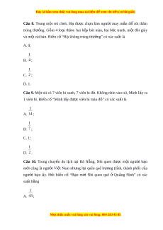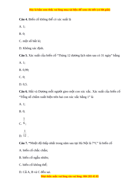 Đây là bản xem th , vu ử i lòng mua tài li u ệ đ xe ể m chi ti t ế (có l i ờ gi i ả ) Câu 4. Bi n c ế ố không th có xác ể su t ấ là A. 1; B. 0; C. m t ộ số bất kì; D. Không xác định. Câu 5. Xác suất c a ủ bi n c ế ố “Tháng 12 dư ng l ơ ch năm ị sau có 31 ngày” b ng ằ A. 1; B. 0,99; C. 0; D. 0,5. Câu 6. H i ả và Dư ng ơ m i ỗ ngư i ờ gieo m t ộ con xúc x c. ắ Xác su t ấ c a ủ bi n ế cố