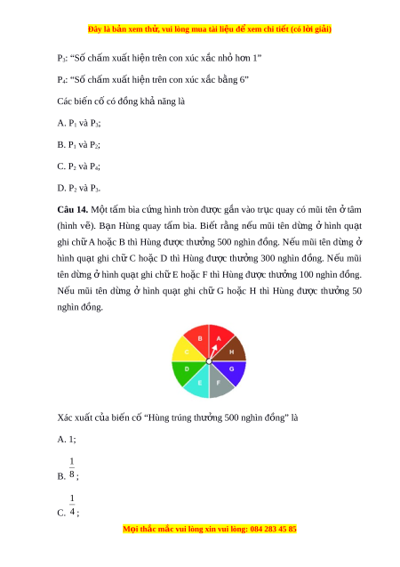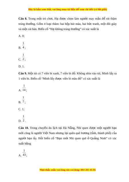 Đây là bản xem th , vu ử i lòng mua tài li u ệ đ xe ể m chi ti t ế (có l i ờ gi i ả ) Câu 8. Trong m t ộ trò ch i ơ , Hạ đư c ợ ch n ọ làm ngư i ờ may m n ắ để rút thăm trúng thư ng. ở G m ồ 4 lo i ạ thăm: hai h p ộ bút màu, hai b c ứ tranh, m t ộ đôi giày và m t ộ cái bàn. Bi n