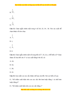 ộ trong 4 số 20; 25; 34 ; 56. Tìm xác su t ấ để ch n đ ọ ư c ợ số tròn ch c. ụ 1 A. 2 ; B. 1; 1 C. 4 ; D. 0. Câu 12. Ch n ọ ng u ẫ nhiên m t ộ s ố trong b n ố s 7; ố 35; 22; y. Đ ể bi n c ế ố “Ch n ọ đư c s ợ ố chia h t ế cho 3” có xác su t ấ b ng 0 t ằ hì s y l ố à A. 24; B. 54; C. 30; D. 32. Câu 13. Gieo m t ộ con xúc xắc đư c ợ ch t ế o cân ạ đ i ố . Xét các bi n c ế s ố au: P1: “Số ch m ấ xu t ấ hi n ệ trên con xúc x c ắ l n ớ h n ơ ho c ặ b ng ằ 1 và nhỏ h n ơ ho c b ặ ng ằ 6” P2: “Số chấm xu t ấ hi n t ệ rên con xúc x c ắ b ng 1” ằ M i