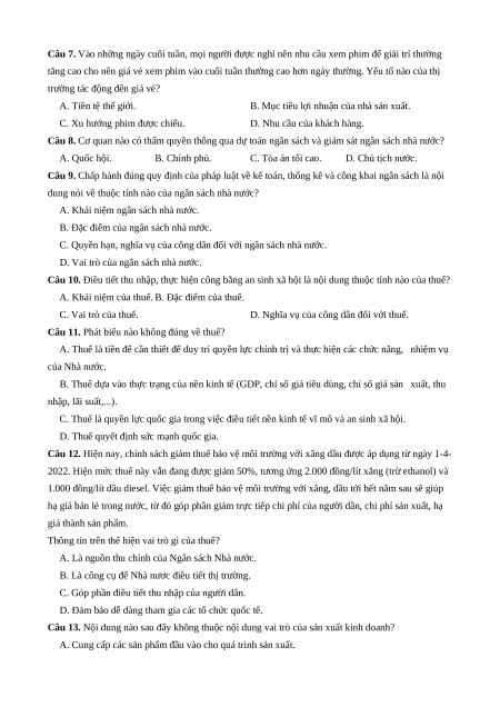 Câu 10. Điều tiết thu nhập, thực hiện công bằng an sinh xã hội là nội dung thuộc tính nào của thuế?