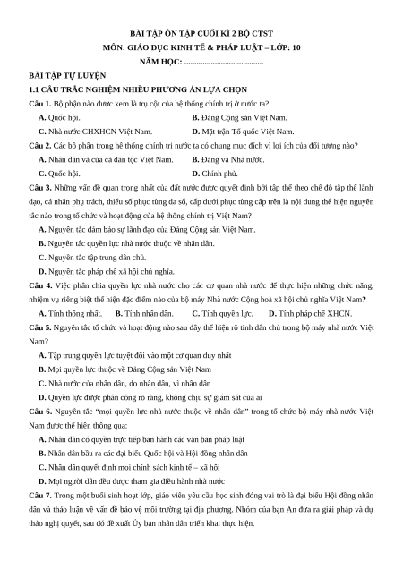 Bài tập trắc nghiệm Cuối kì 2 KTPL 10 Chân trời sáng tạo (có đúng sai, trả lời ngắn)