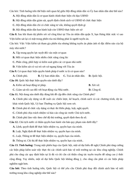 Câu 13. Tình huống: Trong một phiên họp của Quốc hội, một số đại biểu đề nghị Chính phủ tăng cường
