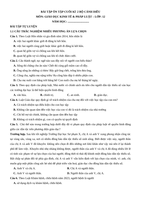 MÔN: GIÁO DỤC KINH TẾ & PHÁP LUẬT – LỚP: 12