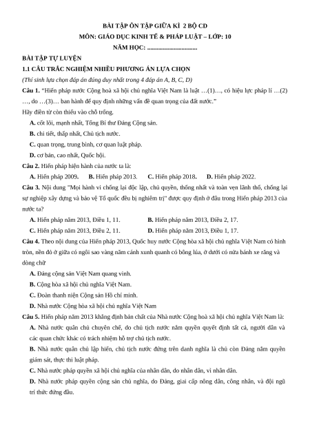 Câu 1. “Hiến pháp nước Cộng hoà xã hội chủ nghĩa Việt Nam là luật …(1)…, có hiệu lực pháp lí …(2)