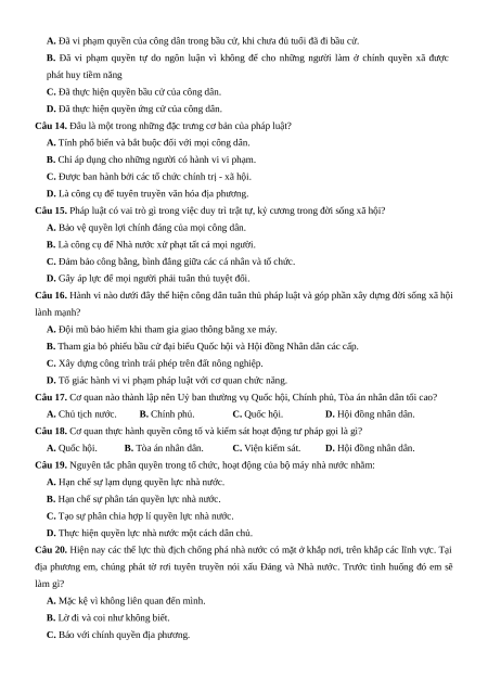 Câu 20. Hiện nay các thế lực thù địch chống phá nhà nước có mặt ở khắp nơi, trên khắp các lĩnh vực. Tại