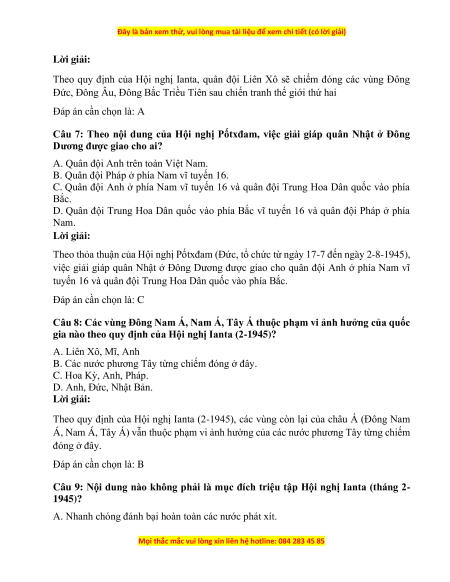 Câu 7: Theo nội dung của Hội nghị Pốtxđam, việc giải giáp quân Nhật ở Đông