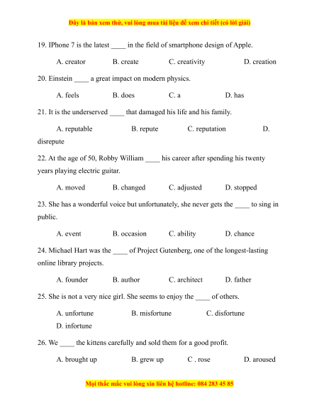19. IPhone 7 is the latest ____ in the field of smartphone design of Apple. A. creator B. create C. creativity D. creation