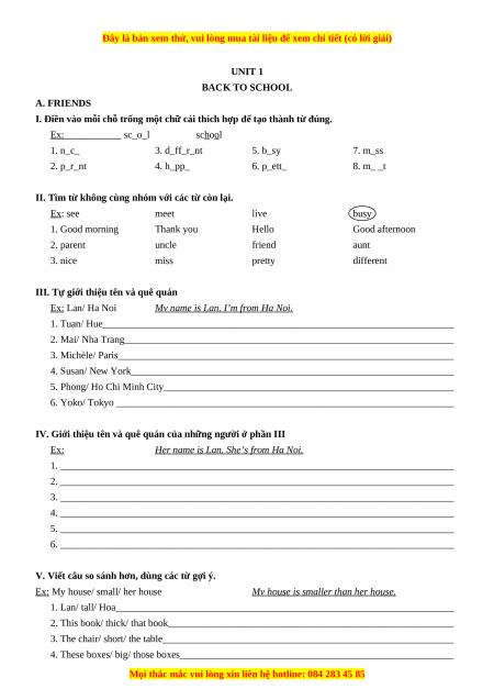 II. Tìm từ không cùng nhóm với các từ còn lại. Ex: see meet live busy 1. Good morning Thank you Hello Good afternoon 2. parent uncle friend aunt 3. nice miss pretty different
