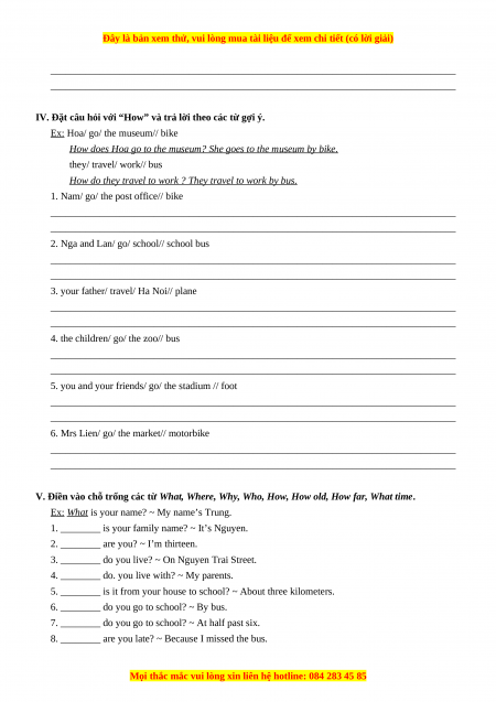 IV. Đặt câu hỏi với “How” và trả lời theo các từ gợi ý. Ex: Hoa/ go/ the museum// bike