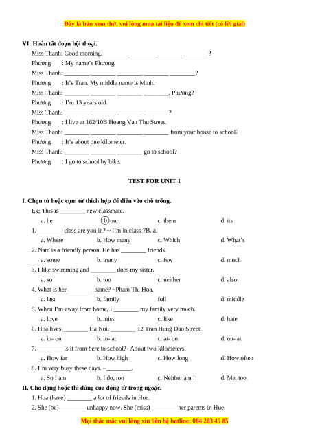- Tailieugiaovien.com.vn giới thiệu Bộ bài tập trắc nghiệm Tiếng Anh lớp 7 biên soạn bởi GV Mai Lan Hương mới nhất nhằm giúp Giáo viên có thêm tài liệu tham khảo bài tập Tiếng Anh lớp 7.