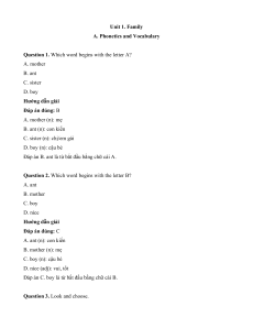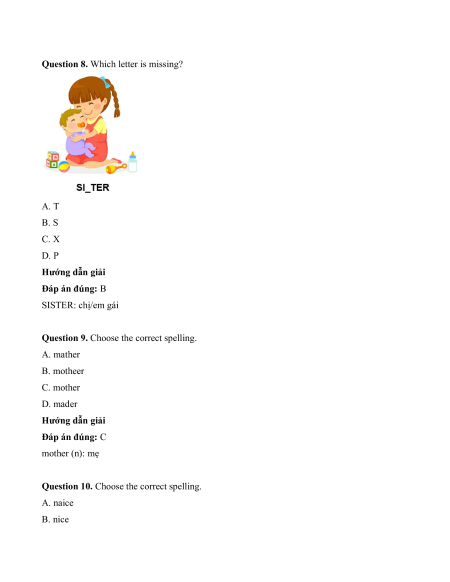 Question 1. Which word begins with the letter A? A. mother B. ant C. sister D. boy Hướng dẫn giải Đáp án đúng: B A. mother (n): mẹ B. ant (n): con kiến C. sister (n): chị/em gái D. boy (n): cậu bé