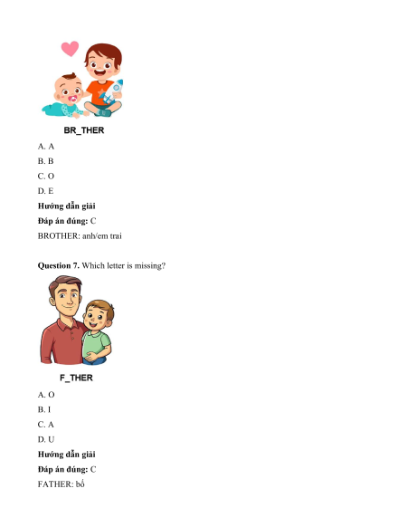 Question 7. Which letter is missing? A. O B. I C. A D. U Hướng dẫn giải Đáp án đúng: C FATHER: bố