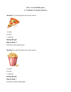 Question 1. Look and choose the correct answer. A. pasta B. pizza C. popcorn Hướng dẫn giải Đáp án đúng: B