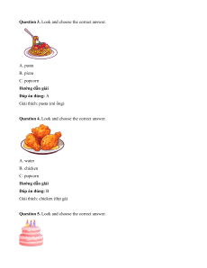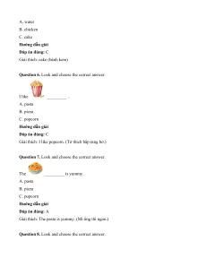 Question 7. Look and choose the correct answer. The _________ is yummy. A. pasta B. pizza C. popcorn Hướng dẫn giải Đáp án đúng: A