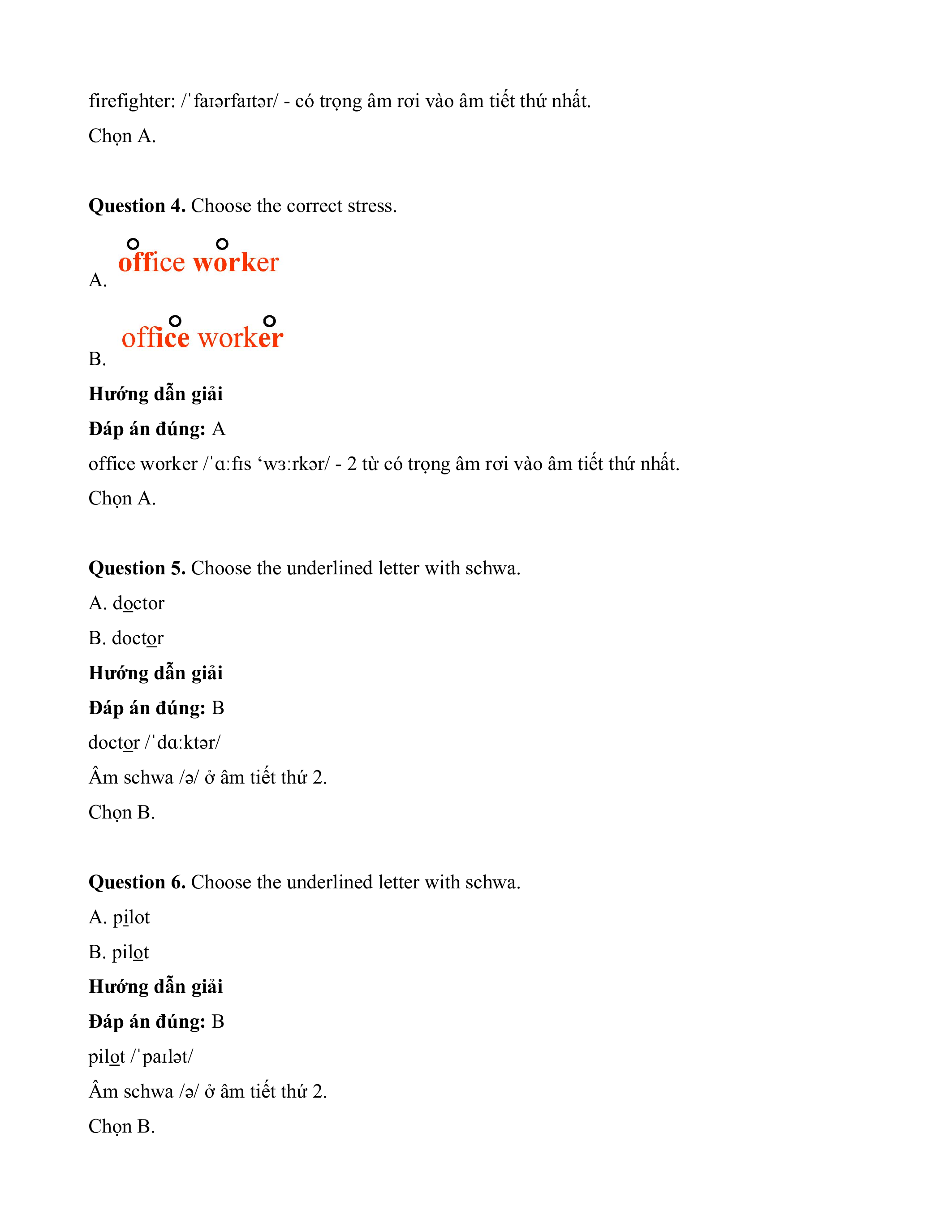 Question 5. Choose the underlined letter with schwa. A. doctor B. doctor Hướng dẫn giải Đáp án đúng: B doctor /ˈdɑːktər/