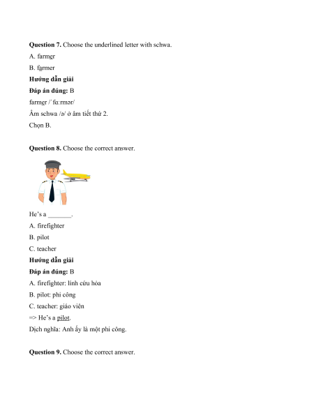 Question 8. Choose the correct answer. He’s a _______. A. firefighter B. pilot C. teacher Hướng dẫn giải Đáp án đúng: B