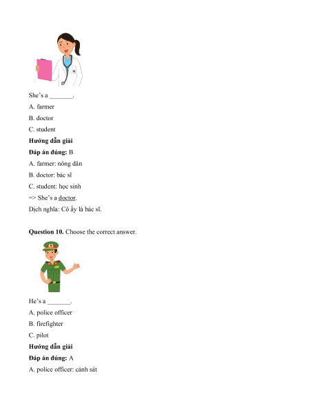 Question 9. Choose the correct answer. She’s a _______. A. farmer B. doctor C. student Hướng dẫn giải Đáp án đúng: B A. farmer: nông dân B. doctor: bác sĩ C. student: học sinh => She’s a doctor.