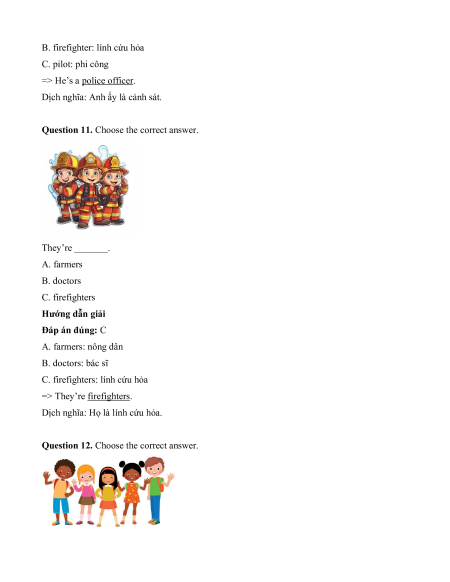 Question 10. Choose the correct answer. He’s a _______. A. police officer B. firefighter C. pilot Hướng dẫn giải Đáp án đúng: A A. police officer: cảnh sát
