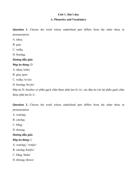 Question 1. Choose the word whose underlined part differs from the other three in pronunciation. A. takes B. gets C. walks D. brushes Hướng dẫn giải: Đáp án đúng: D A. takes /teɪks/ B. gets /ɡets/ C. walks /wɔːks/ D. brushes /brʌʃɪz/