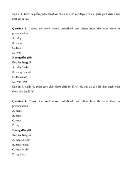 Question 3. Choose the word whose underlined part differs from the other three in pronunciation. A. rides B. walks C. does D. lives Hướng dẫn giải: Đáp án đúng: B A. rides /raɪdz/ B. walks /wɔːks/ C. does /dʌz/ D. lives /lɪvz/