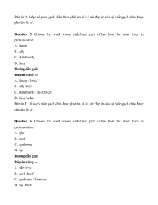 Question 6. Choose the word whose underlined part differs from the other three in pronunciation. A. take B. catch C. handsome D. bad Hướng dẫn giải: Đáp án đúng: A A. take /teɪk/ B. catch /kætʃ/ C. handsome /ˈhænsəm/ D. bad /bæd/