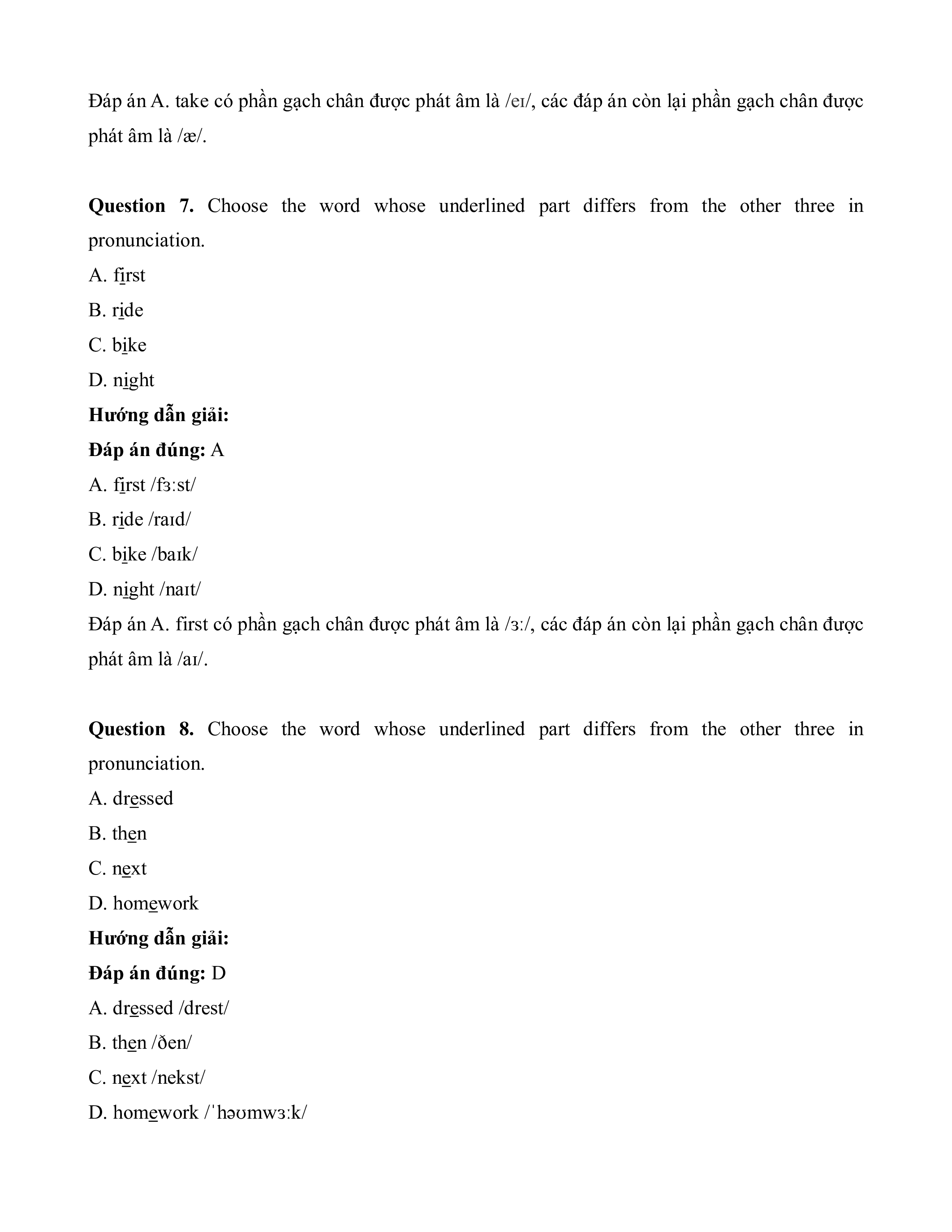 Question 7. Choose the word whose underlined part differs from the other three in pronunciation. A. first B. ride C. bike D. night Hướng dẫn giải: Đáp án đúng: A A. first /fɜːst/ B. ride /raɪd/ C. bike /baɪk/ D. night /naɪt/