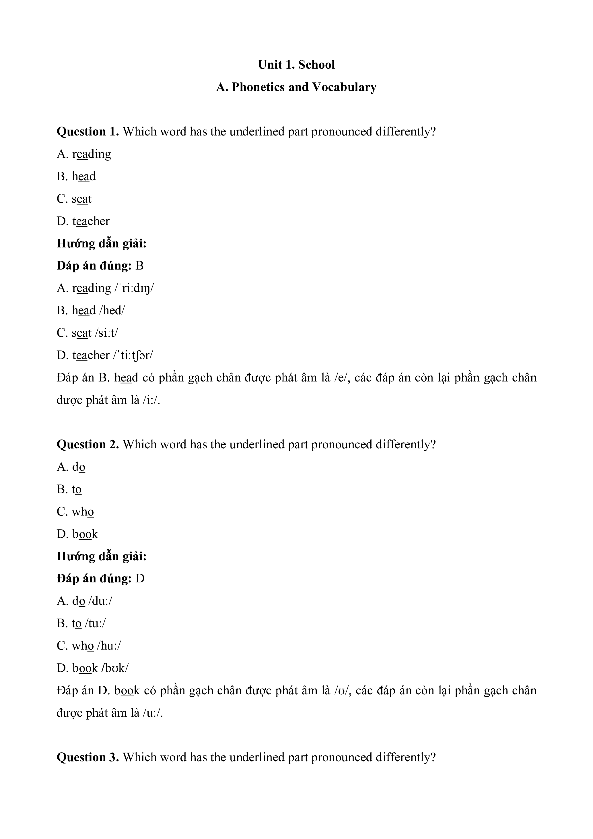 Question 1. Which word has the underlined part pronounced differently? A. reading B. head C. seat D. teacher Hướng dẫn giải: Đáp án đúng: B A. reading /ˈriːdɪŋ/ B. head /hed/ C. seat /siːt/ D. teacher /ˈtiːtʃər/