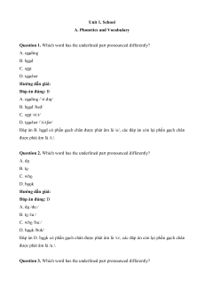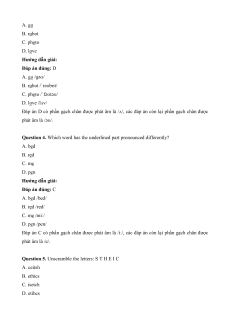 Question 2. Which word has the underlined part pronounced differently? A. do B. to C. who D. book Hướng dẫn giải: Đáp án đúng: D A. do /duː/ B. to /tuː/ C. who /huː/ D. book /bʊk/