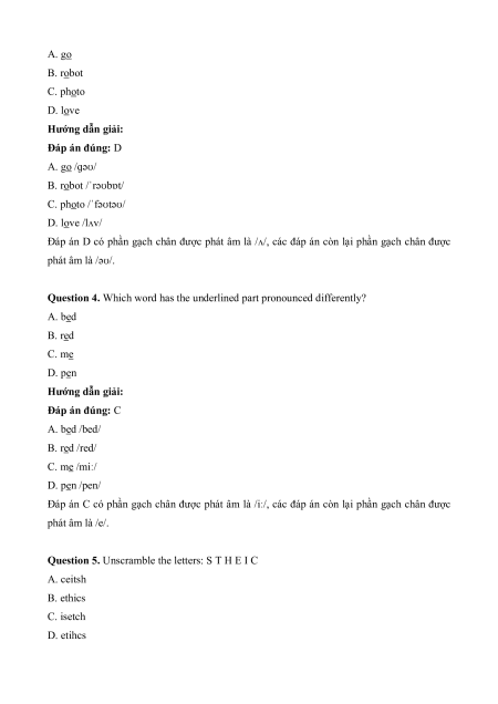Question 3. Which word has the underlined part pronounced differently? A. go B. robot C. photo D. love Hướng dẫn giải: Đáp án đúng: D A. go /ɡəʊ/ B. robot /ˈrəʊbɒt/ C. photo /ˈfəʊtəʊ/ D. love /lʌv/