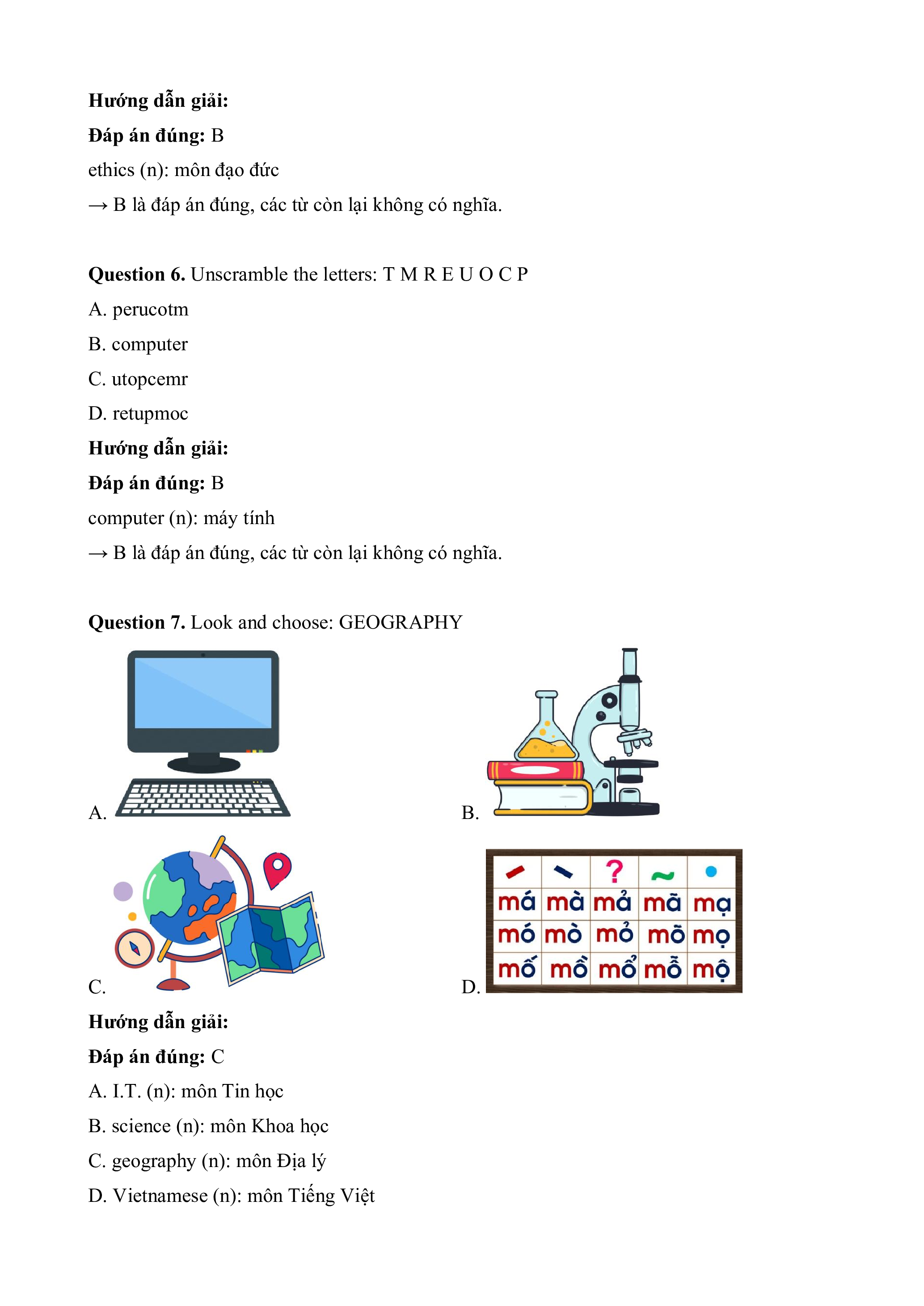 Question 7. Look and choose: GEOGRAPHY A. B. C. D. Hướng dẫn giải: Đáp án đúng: C A. I.T. (n): môn Tin học