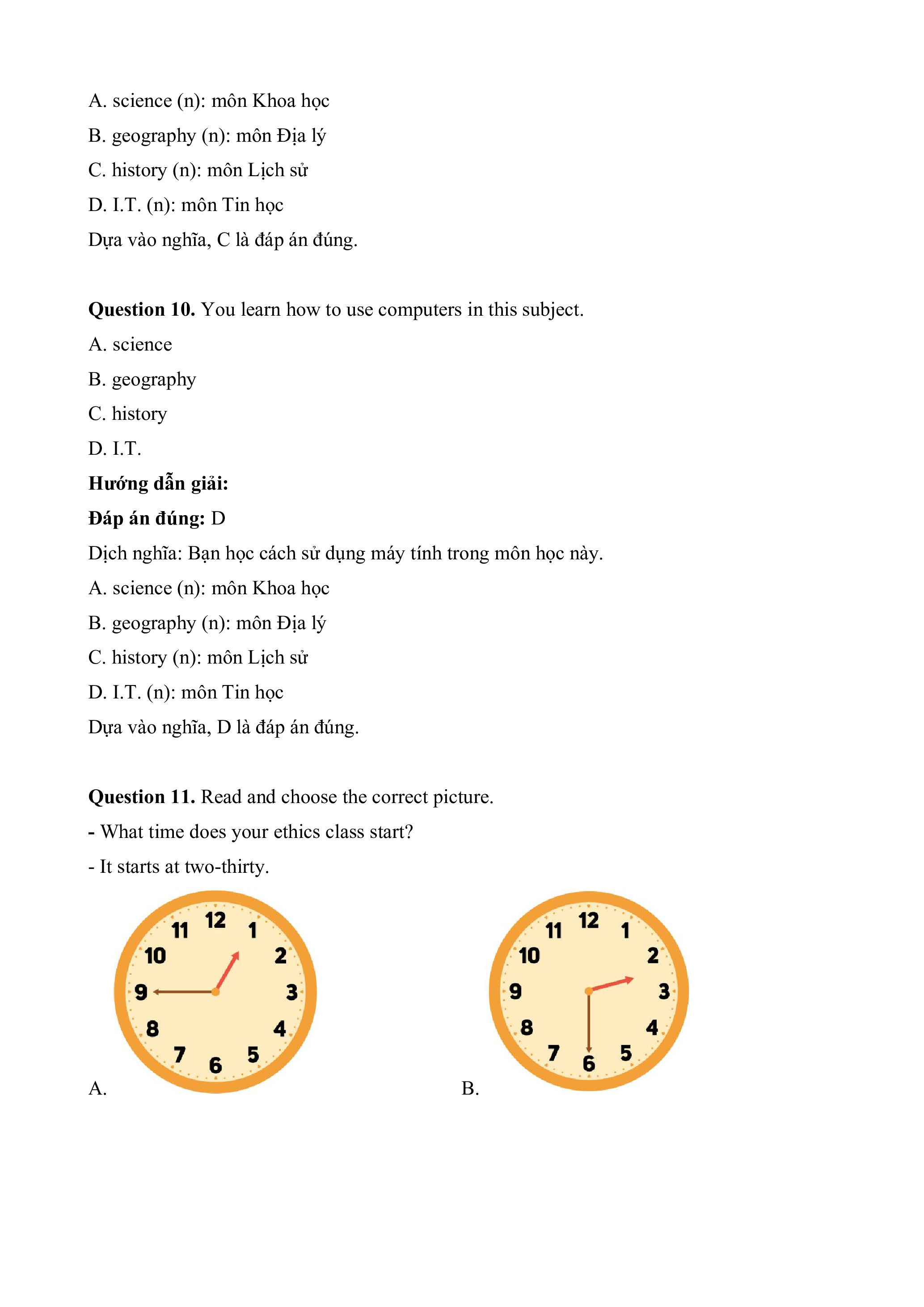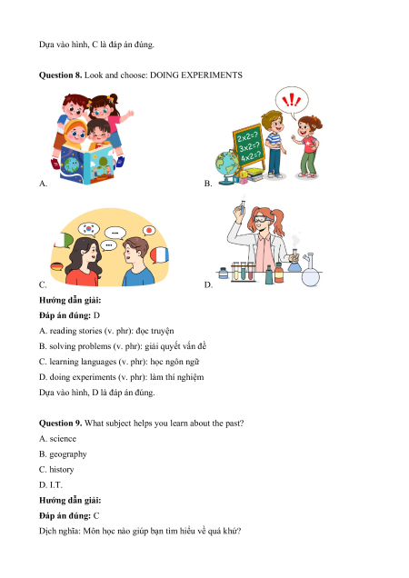 Question 9. What subject helps you learn about the past? A. science B. geography C. history D. I.T. Hướng dẫn giải: Đáp án đúng: C