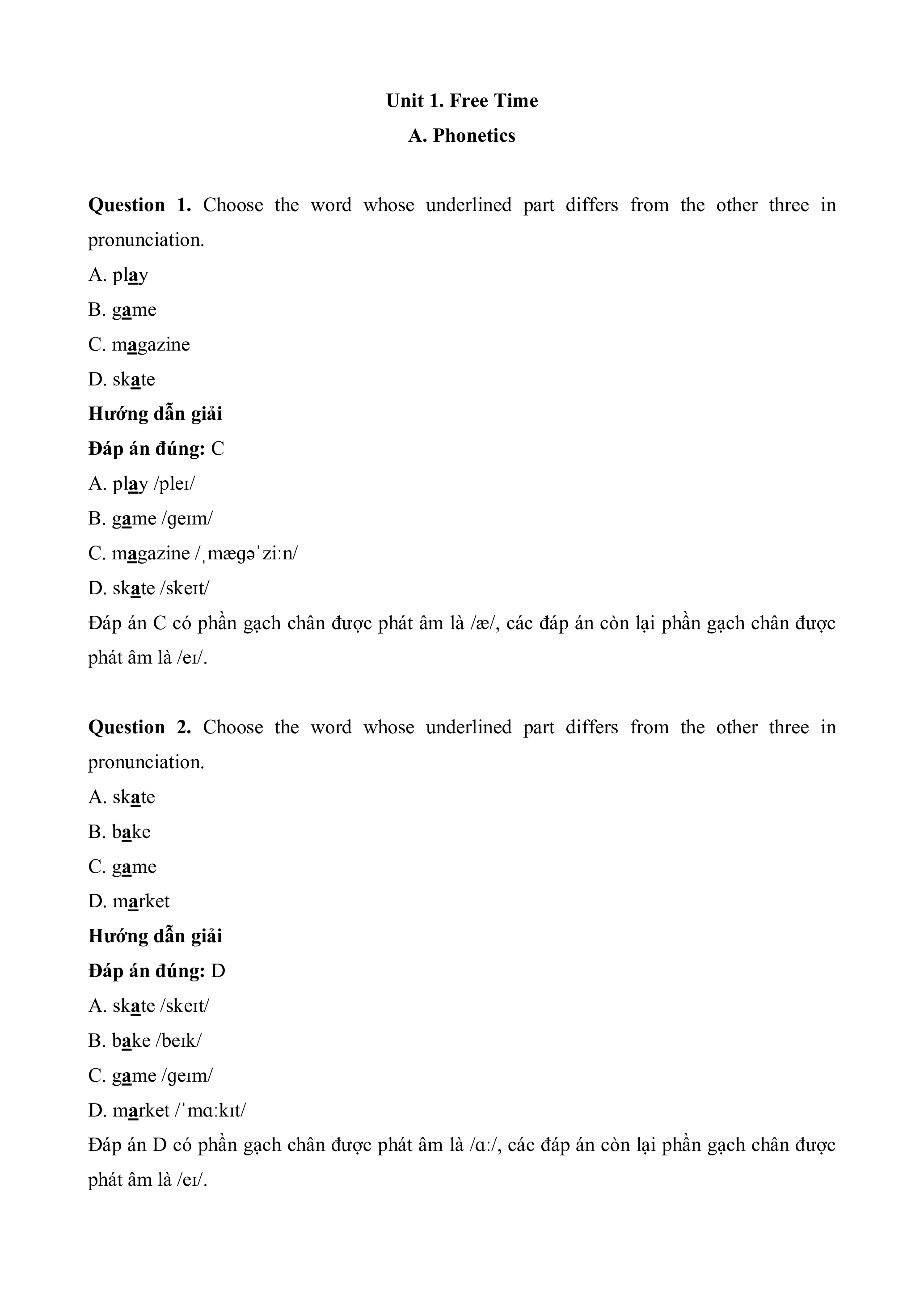 Question 1. Choose the word whose underlined part differs from the other three in pronunciation. A. play B. game C. magazine D. skate Hướng dẫn giải Đáp án đúng: C A. play /pleɪ/ B. game /ɡeɪm/