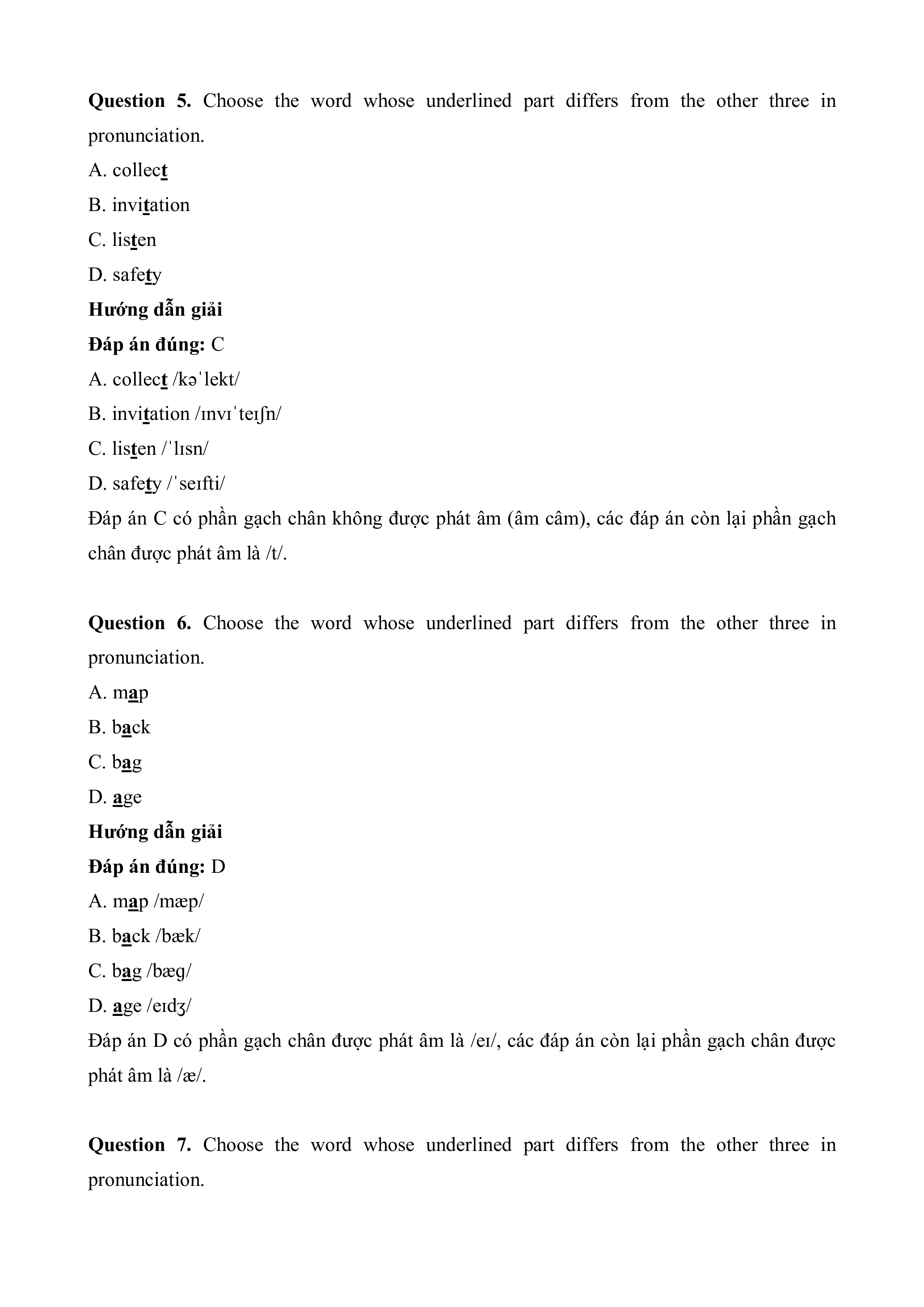 Question 5. Choose the word whose underlined part differs from the other three in pronunciation. A. collect B. invitation C. listen D. safety Hướng dẫn giải Đáp án đúng: C A. collect /kəˈlekt/