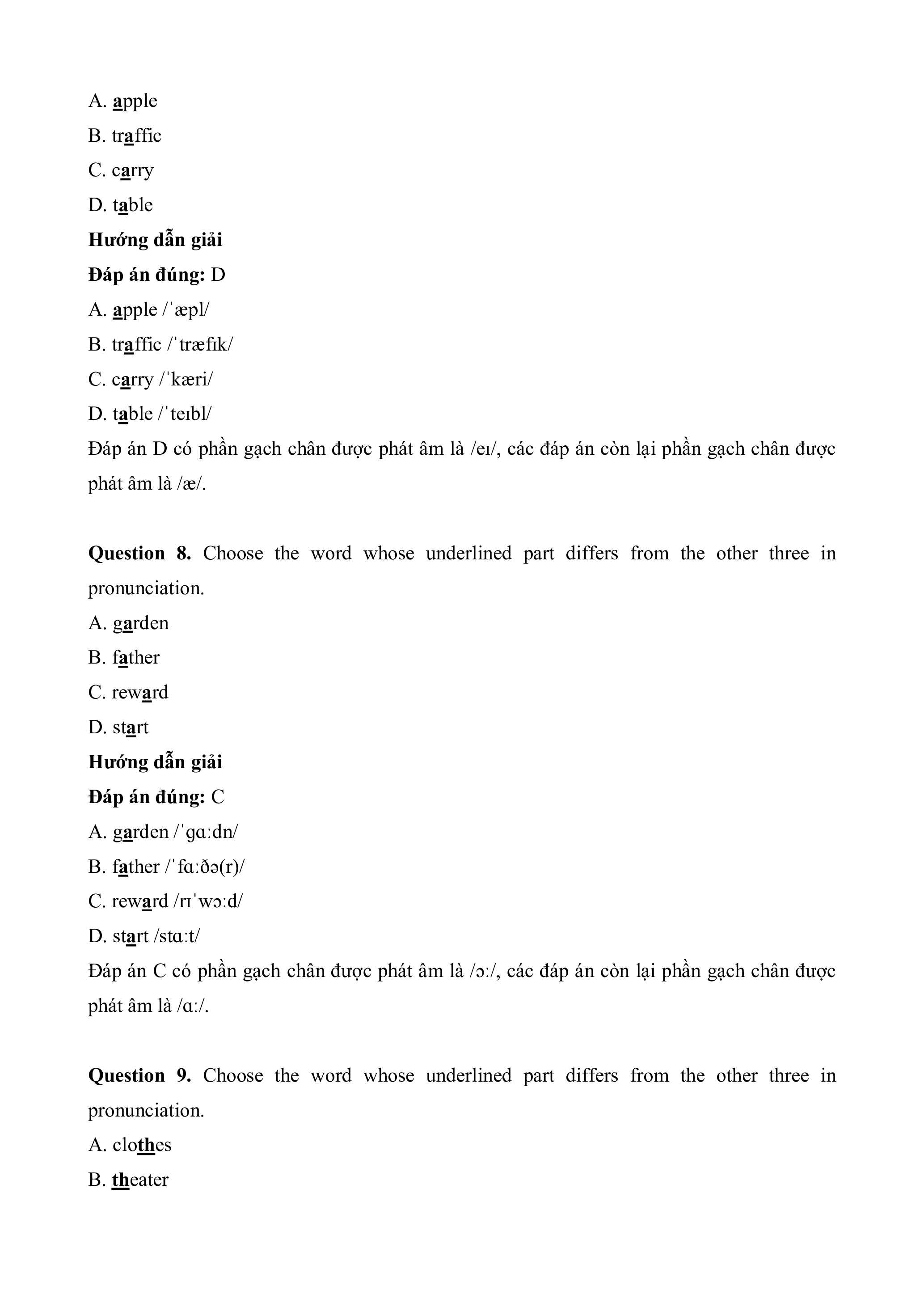 Question 7. Choose the word whose underlined part differs from the other three in pronunciation. A. apple B. traffic C. carry D. table Hướng dẫn giải Đáp án đúng: D A. apple /ˈæpl/ B. traffic /ˈtræfɪk/ C. carry /ˈkæri/ D. table /ˈteɪbl/