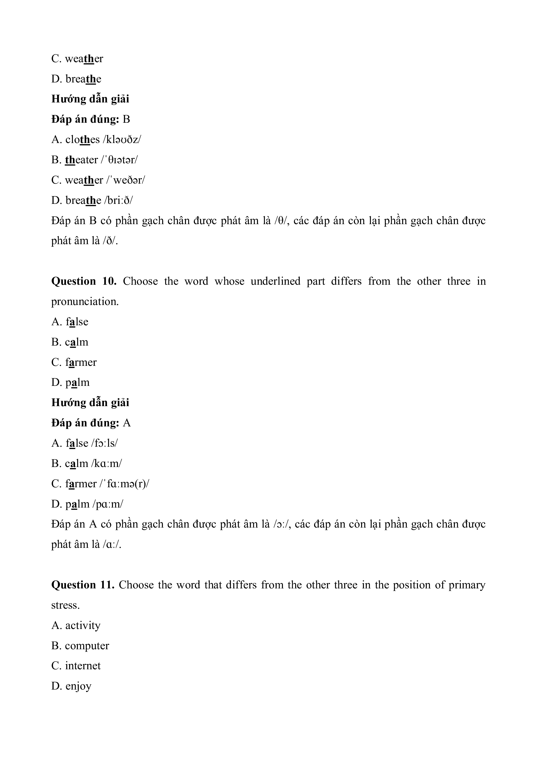 Question 9. Choose the word whose underlined part differs from the other three in pronunciation. A. clothes B. theater