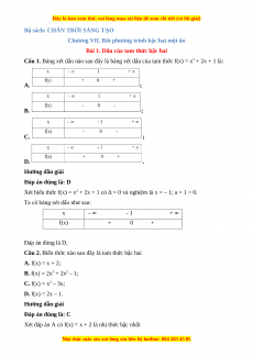 Câu 1. Bảng xét dấu nào sau đây là bảng xét dấu của tam thức f(x) = x2 + 2x + 1 là: A. ; B. ; C. ; D. . Hướng dẫn giải Đáp án đúng là: D